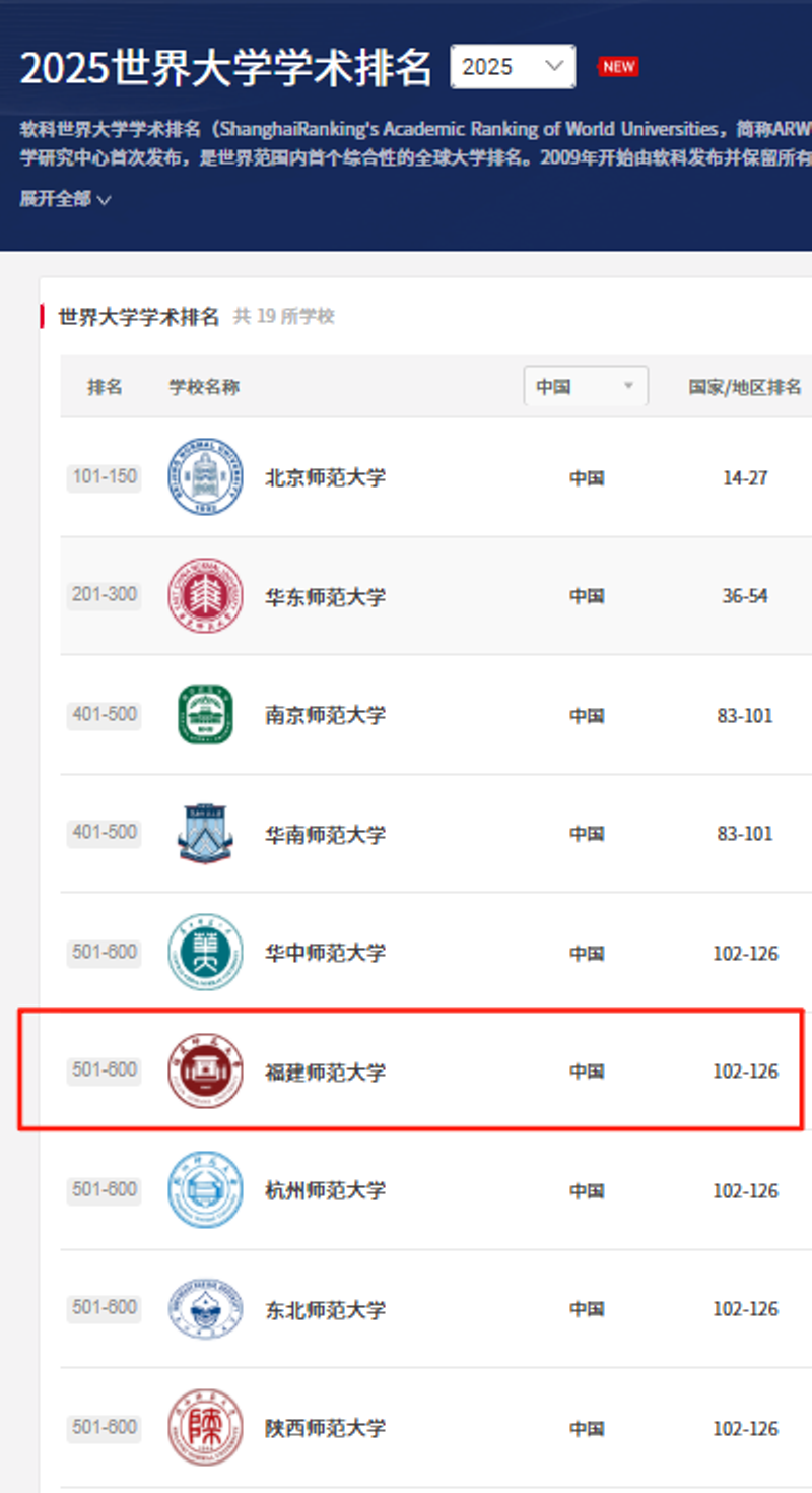 8月15日,软科发布“2025软科世界大学学术排名”,我校位列全球高校501-600名区间、中国内地师范类高校第5名(与华中师范大学、杭州师范大学、东北师范大学、陕西师范大学并列)。较上年,我校全球高校位次提升100区间值,中国内地师范类高校位次再升2位。